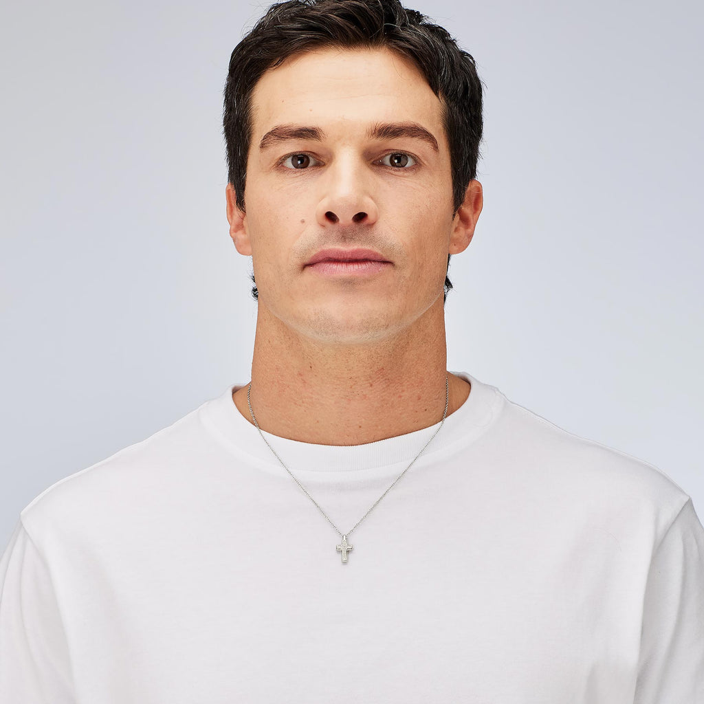 Collana catena lunga in acciaio 316L lucido e sabbiato, con pendente a forma di croce.