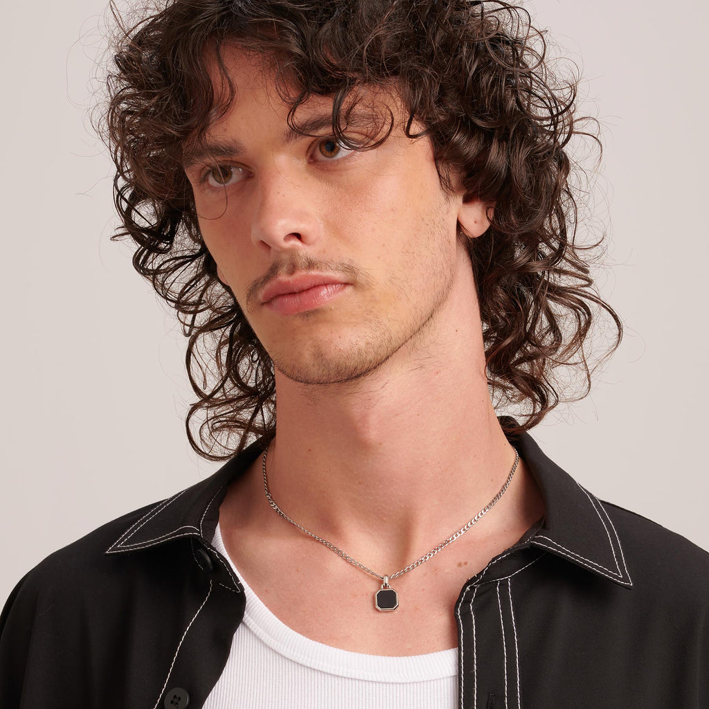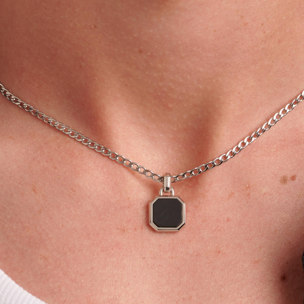 Collana catena grumetta girocollo in acciaio 316L e pendente con onice nero.