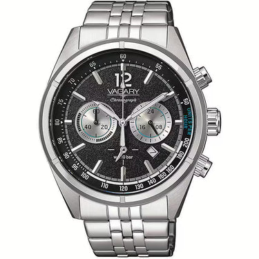 Orologio da uomo di Vagary della collezione Rockwell. Cronografo con movimento al quarzo citizen e resistenza all'acqua di 10 ATM. La cassa é in acciaio con lunetta fitta con diametro di 42 mm. Quadrante nero con indici applicati. Bracciale in acciaio con chiusura a pulsante. Presenza di datario e vetro minerale. La referenza è: IV4-811-51.