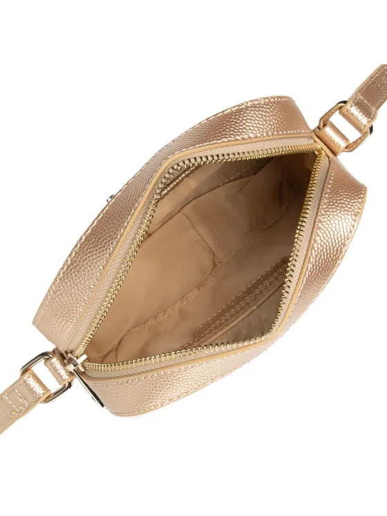 L’interno è semplice ma ben organizzato: uno scomparto principale rivestito in tessuto tinta unita, perfetto per contenere smartphone, portacarte, chiavi e piccoli accessori indispensabili. La struttura rigida permette alla borsa di mantenere la sua silhouette elegante anche con un contenuto minimo, valorizzando la pulizia del design.