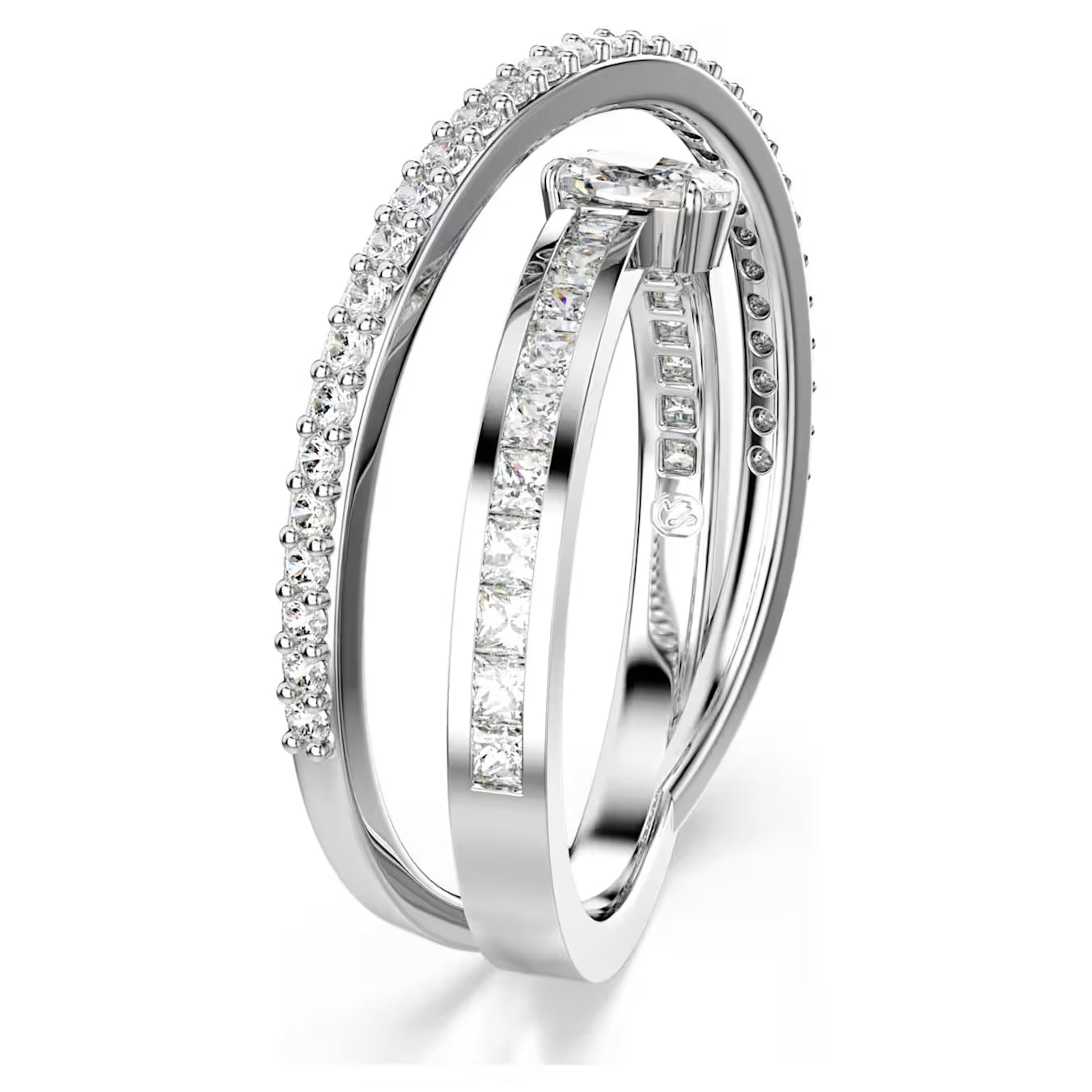 Questo anello Hyperbola intrecciato integra più stili in un unico design meravigliosamente compatto. Le sue due fasce placcate rodio sovrapposte sono impreziosite da Swarovski Zirconia trasparenti con montature a binario e a griffe. Un cristallo aggiuntivo taglio Oval è inframmezzato per un impatto aggiuntivo. Abbinalo ad un bangle coordinato per un look davvero mozzafiato.