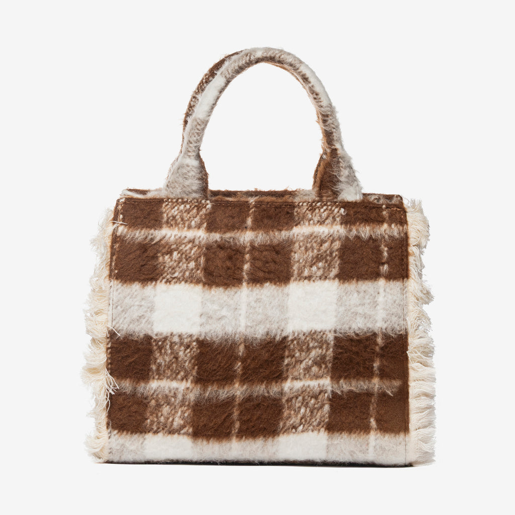 Calda, originale e perfettamente in linea con le tendenze della stagione: la Borsa Marc Ellis Cocoa è l’accessorio ideale per chi ama distinguersi anche nei mesi più freddi. Il pattern a quadri nei toni del marrone e panna esprime un’eleganza contemporanea ispirata al mondo del design nordico. Le frange laterali e il ricamo frontale con logo donano un tocco cozy chic che non passa inosservato.