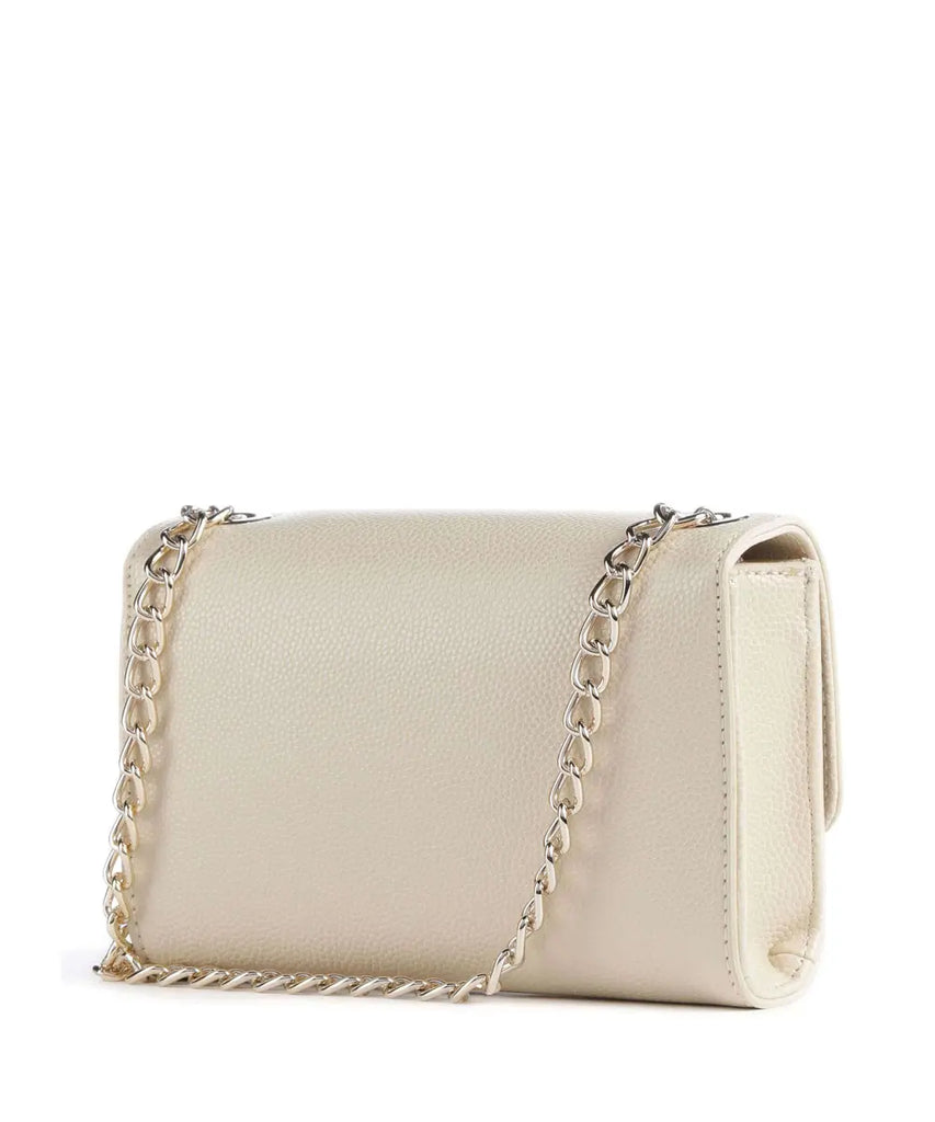 Realizzata in similpelle rigida di alta qualità, la borsa presenta una silhouette stabile e moderna, pensata per durare nel tempo. La chiusura a spina garantisce praticità e sicurezza durante l’uso quotidiano, mentre la tracolla removibile in metallo con finitura oro lucido ti consente di scegliere come indossarla: crossbody, a spalla o come pochette per la sera. A completare il design, un elegante tag decorativo firmato Valentino e il discreto logo frontale.