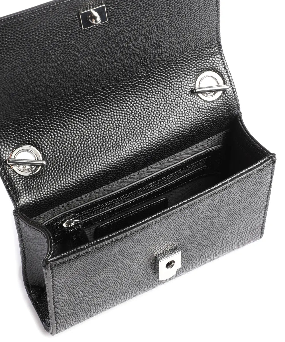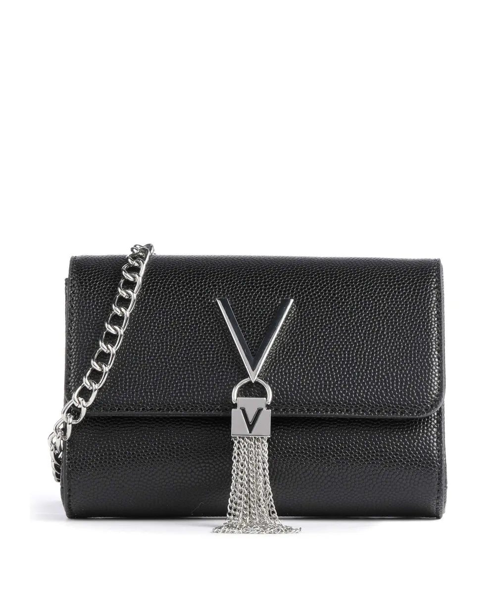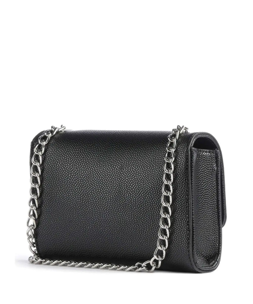 Realizzata in pelle sintetica rigida, garantisce resistenza e durata nel tempo, mantenendo una forma impeccabile. La borsa è dotata di una chiusura a spina che assicura praticità e sicurezza. La tracolla in metallo con finitura nera è removibile, permettendo di trasformare l’accessorio da crossbody a pochette in pochi secondi. Completa il look un tag decorativo firmato Valentino, per un tocco di riconoscibilità in più.