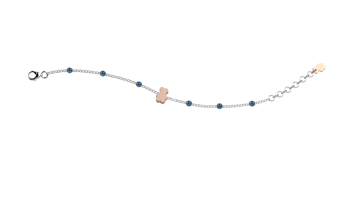 Delizioso bracciale in argento impreziosito da perline azzurre e dal dolcissimo orsetto Tato.