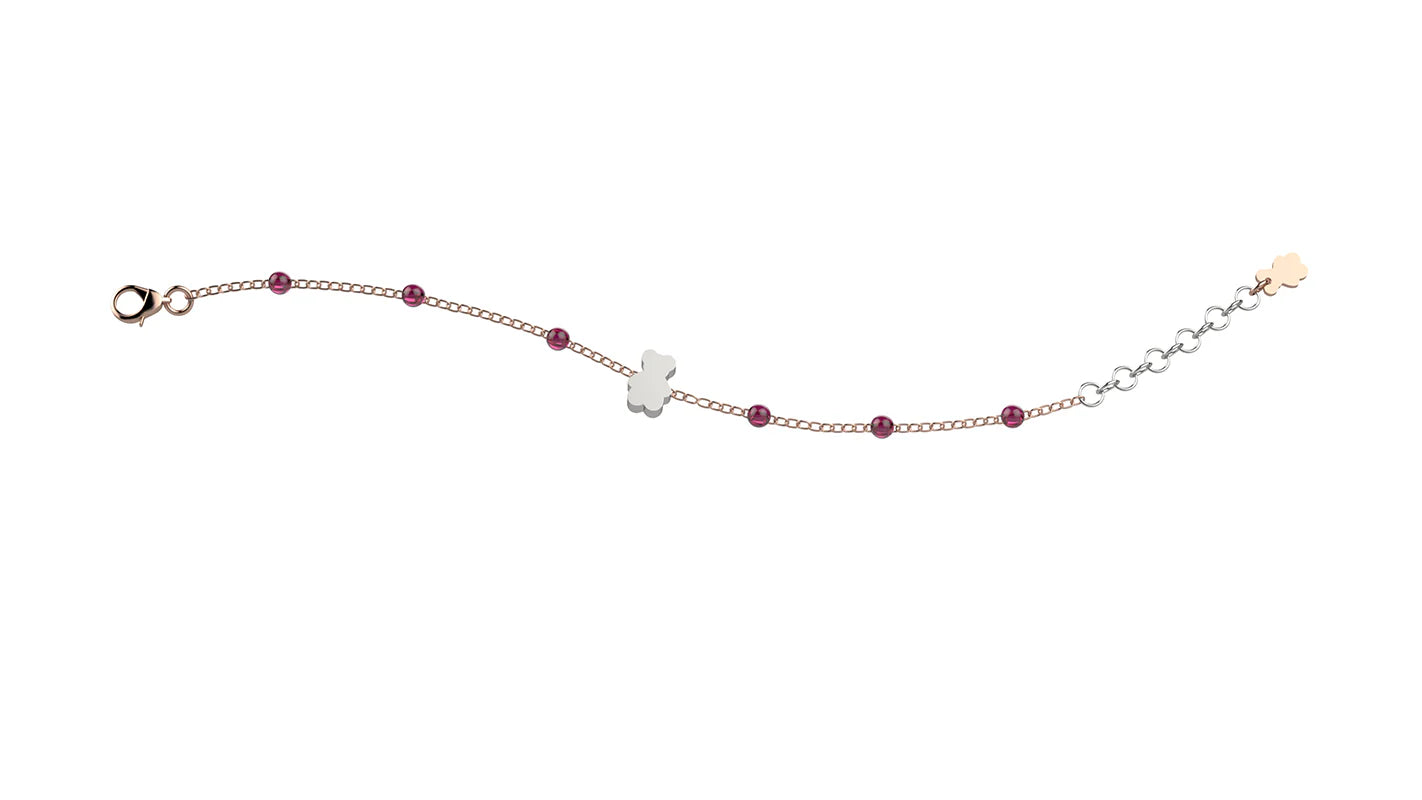 Delizioso bracciale in argento placcato in oro rosa impreziosito da perline lilla e dal dolcissimo orsetto Tato.