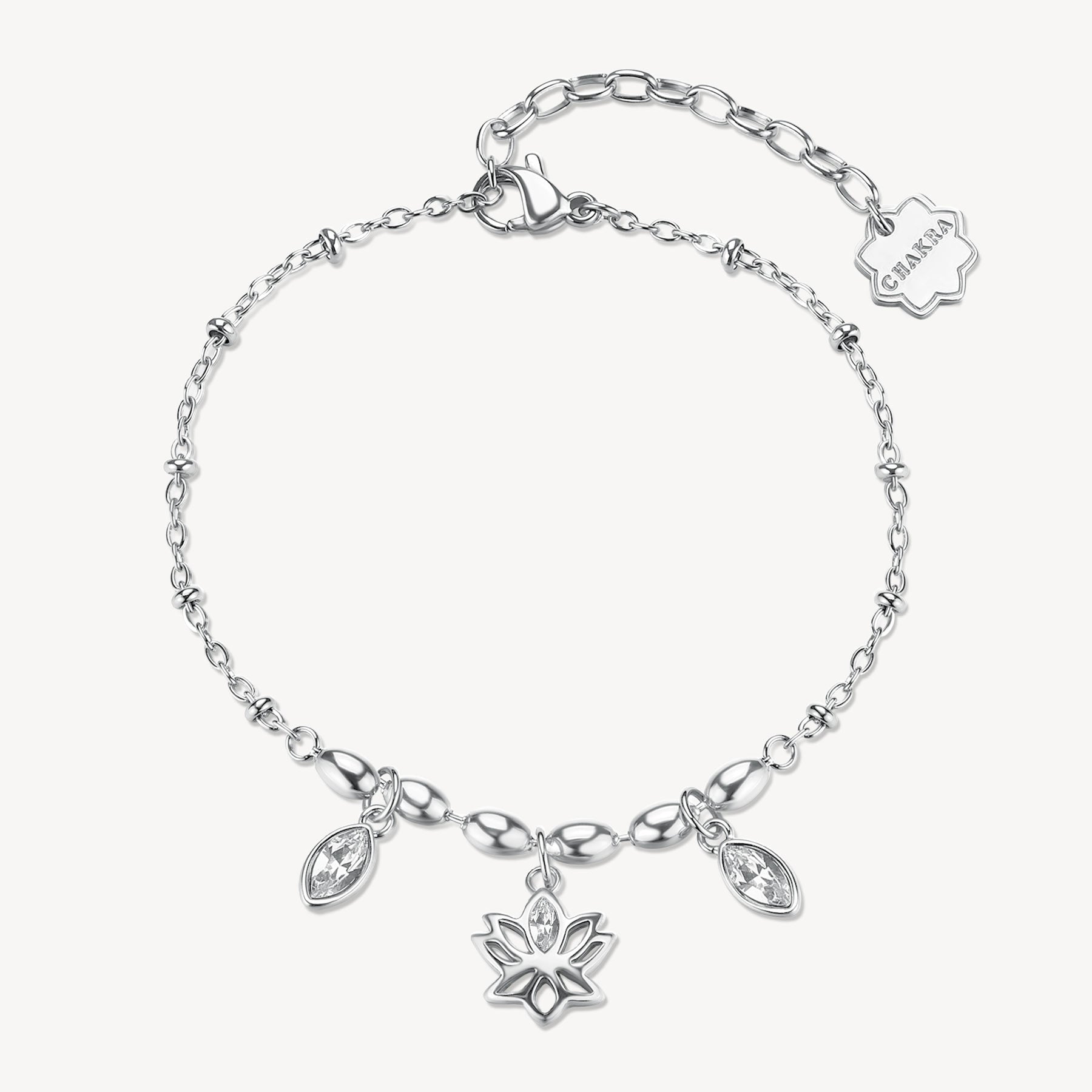 Bracciale in acciaio 316L e pendenti con fiore di loto e cristalli.