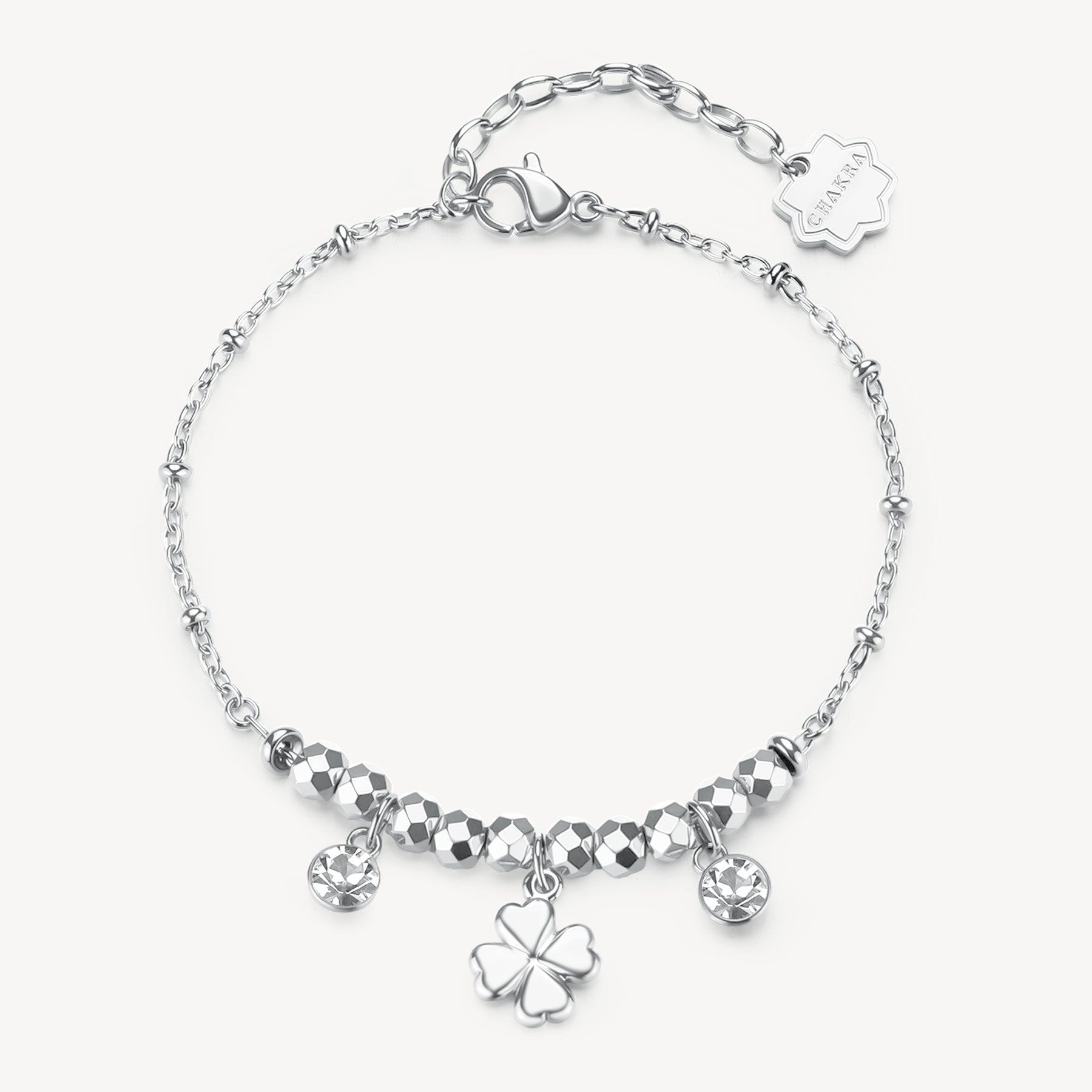 Bracciale in acciaio 316L e pendenti con quadrifoglio e cristalli.
