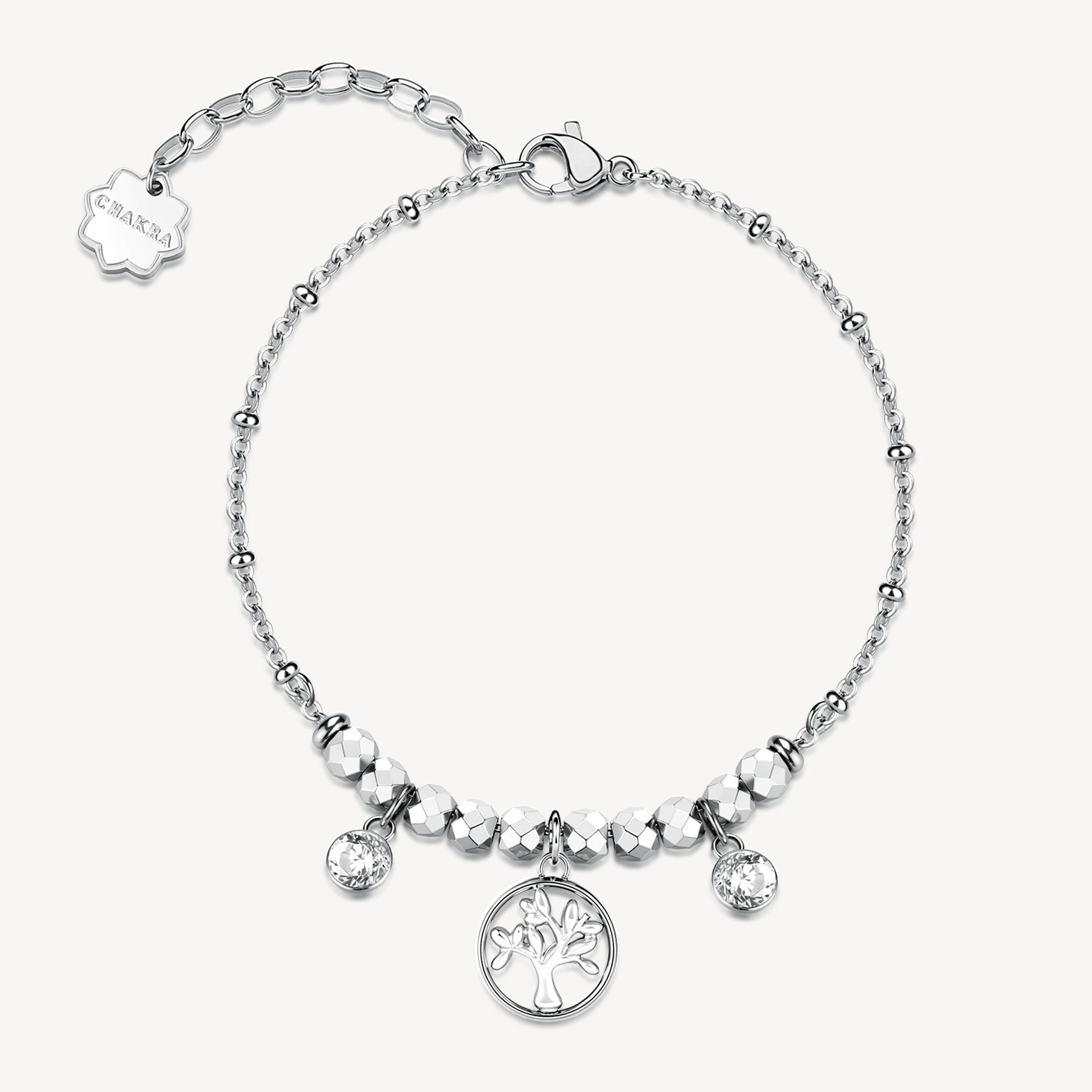 Bracciale in acciaio 316L e pendenti con albero della vita e cristalli.