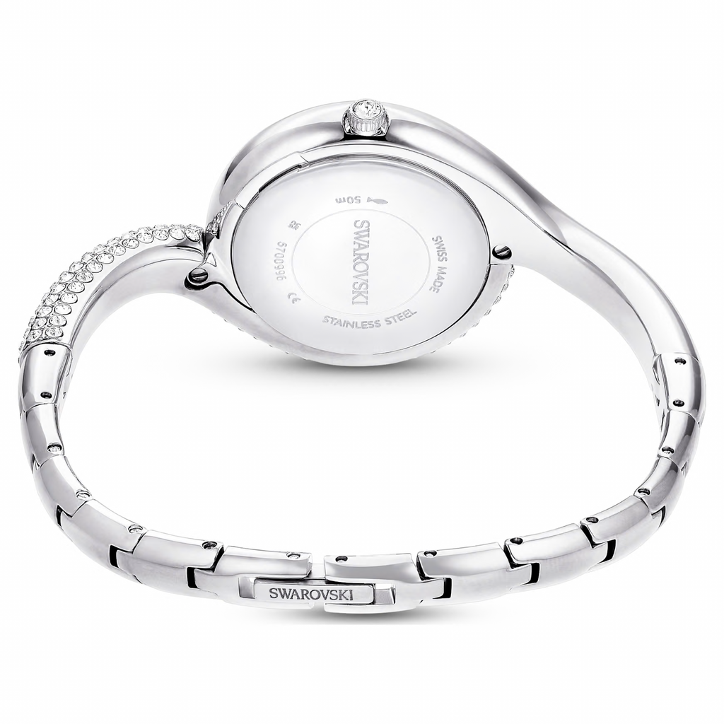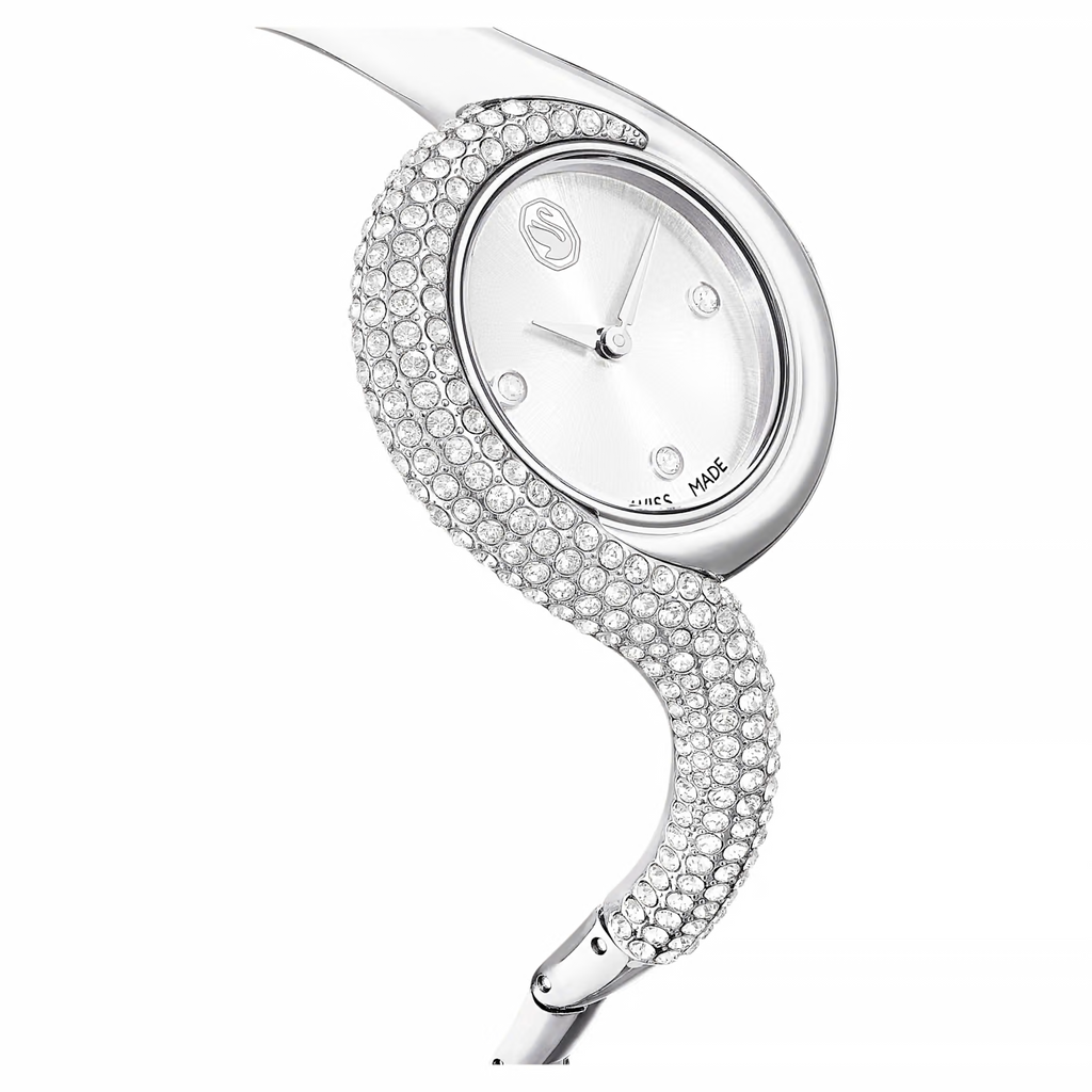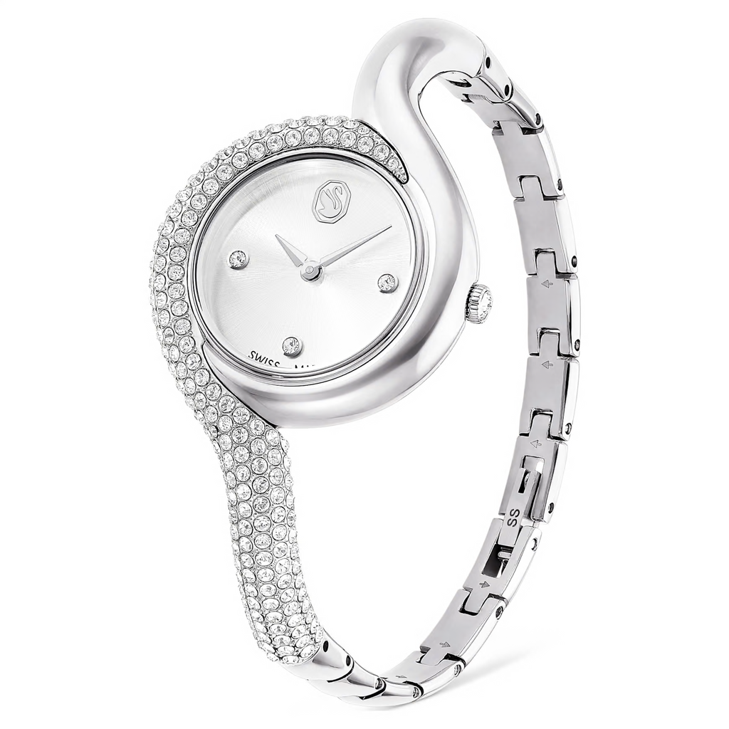Questo accattivante orologio Dextera trae ispirazione dagli orologi classici di epoca vintage. Il design da 29 mm in acciaio inossidabile è impreziosito in modo creativo da un pavé di cristalli Cry su metà della lunetta e metà del bracciale. Il quadrante minimalista presenta un effetto con motivo sunray ed è accentuato solo da tre indici delle ore in cristallo e dal logo cigno a ore 12. Per la creazione di questo orologio sono stati utilizzati 203 cristalli, incluso il singolo cristallo incastonato nella corona. Questo orologio Swiss Made è resistente all’acqua fino a 50 metri ed è una pura espressione della raffinatezza di Swarovski.